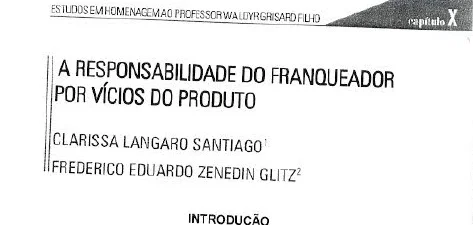 REFERÊNCIA: SANTIAGO, Clarissa Langaro; GLITZ, Frederico Eduardo Zenedin. A responsabilidade do franqueador por vício do produto. In OLIVEIRA, Eloete Camilli; MACEI, Demetrius Nichele (Org.). Estudos em Homenagem ao Professor Waldyr Grisard Filho. Curitiba: Instituto Memória, 2017, p. 239-261.