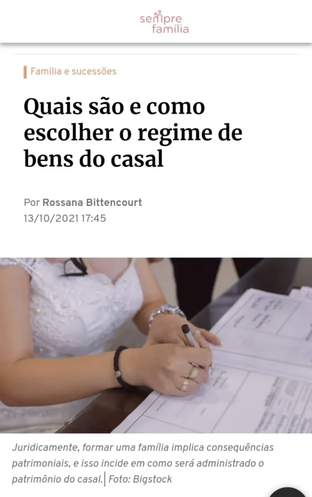 Quais são e como escolher o regime de bens do casal Por Rossana Bittencourt 13/10/2021 17:45 Juridicamente, formar uma família